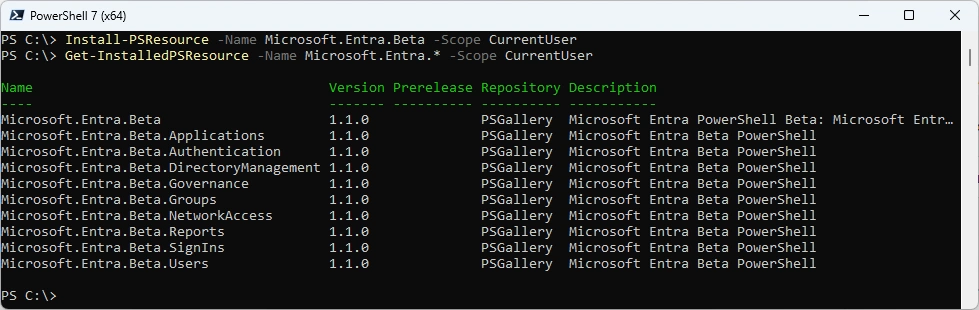 Install-PSResource -Name Microsoft.Entra.Beta -Scope CurrentUser