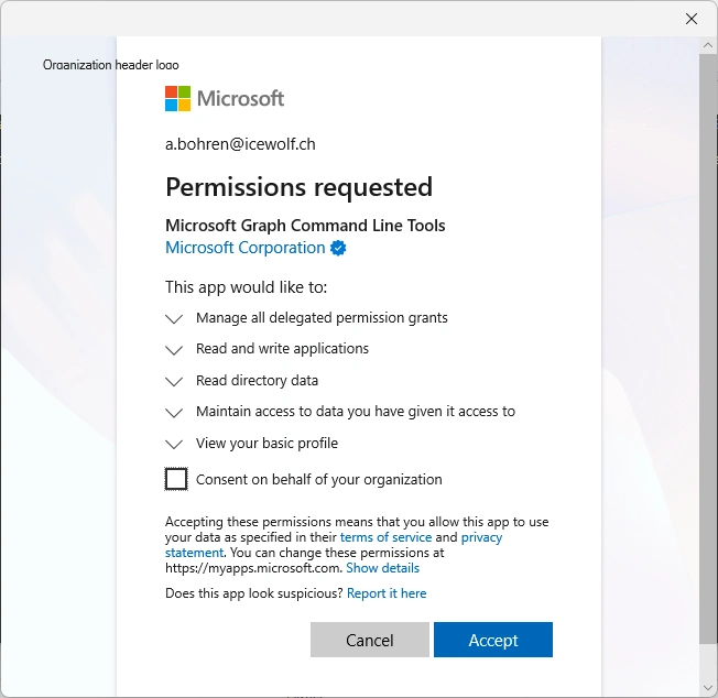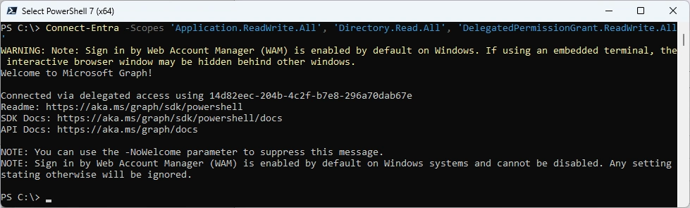 Connect-Entra -Scopes 'Application.ReadWrite.All', 'Directory.Read.All', 'DelegatedPermissionGrant.ReadWrite.All'