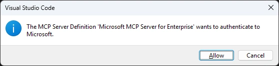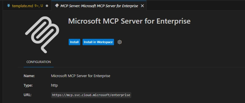 - Click Install Microsoft MCP Server for Enterprise to open VS Code’s MCP install page.