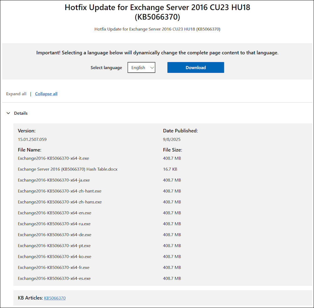 - Hotfix update for Exchange Server Subscription Edition RTM HU2: September 8, 2025 (KB5066373)