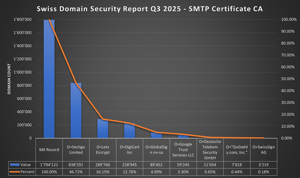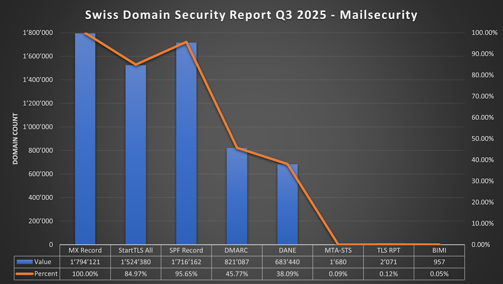 I’ve published a new Swiss Domain Security Report Q3 2025 to rise awareness about the available Security technologies around Domains and Mailsecurity. It shows the adoption of diffrent technologies for the whole .ch TLD (Top Level Domain).