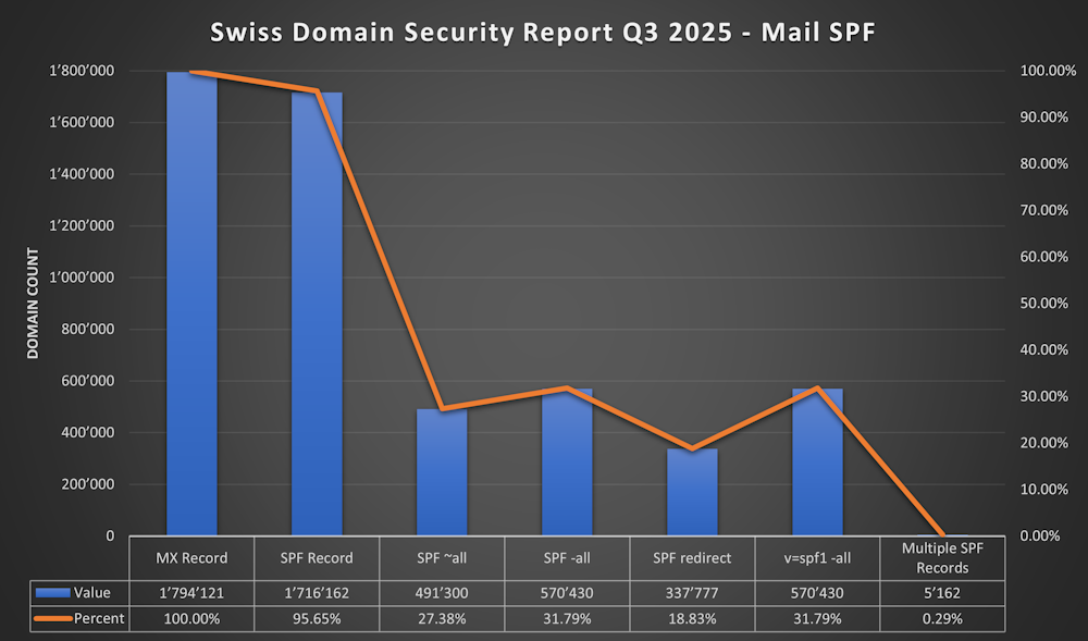 - 31.79.82% (570'430) of .ch Domains with MX have “SPF ~all”