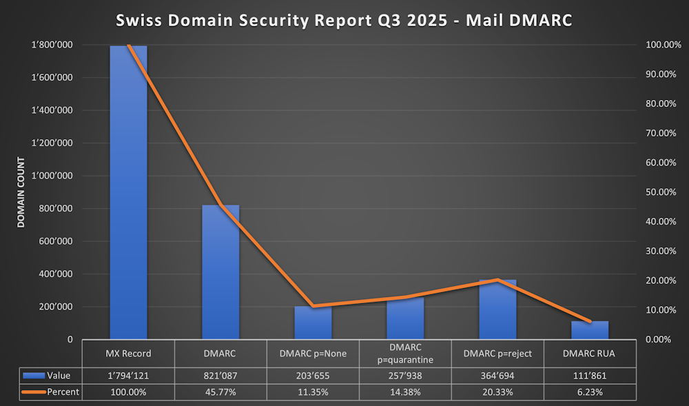 - 45.77% (821'087) of Domains with MX have a DMARC Record