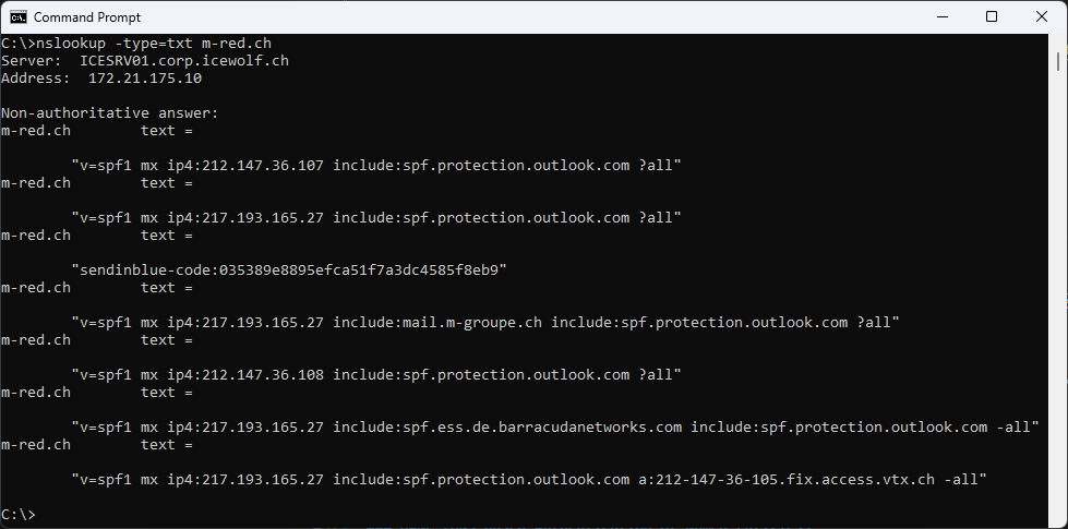 Bad Example: nslookup -type=txt m-red.ch (does not work like that)
