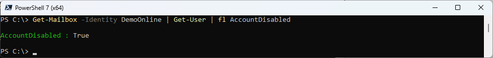 Get-Mailbox -Identity DemoOnline | Get-User | fl AccountDisabled