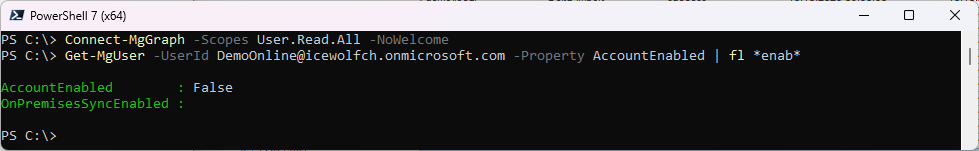 Get-MgUser -UserId DemoOnline@icewolfch.onmicrosoft.com -Property AccountEnabled | fl *enab*