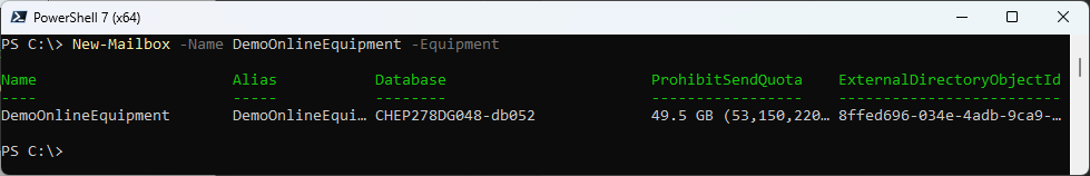 New-Mailbox -Name DemoOnlineEquipment -Equipment