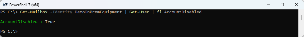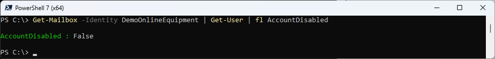 Get-Mailbox -Identity DemoOnlineEquipment | Get-User | fl AccountDisabled
