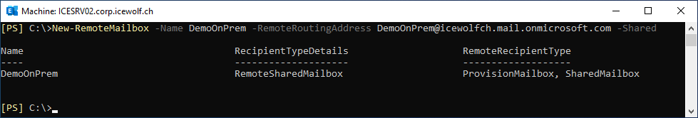 New-RemoteMailbox -Name DemoOnPrem -RemoteRoutingAddress DemoOnPrem@icewolfch.mail.onmicrosoft.com -Shared