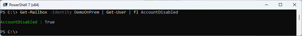 Get-Mailbox -Identity DemoOnPrem | Get-User | fl AccountDisabled