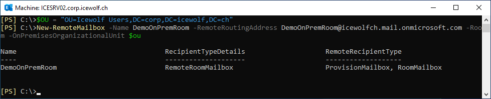 New-RemoteMailbox -Name DemoOnPremRoom -RemoteRoutingAddress DemoOnPremRoom@icewolfch.mail.onmicrosoft.com -Room -OnPremisesOrganizationalUnit $OU