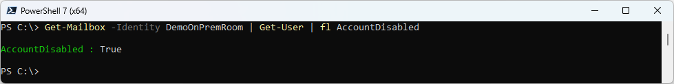 Get-Mailbox -Identity DemoOnPremRoom | Get-User | fl AccountDisabled