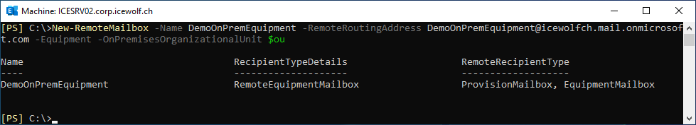 New-RemoteMailbox -Name DemoOnPremEquipment -RemoteRoutingAddress DemoOnPremEquipment@icewolfch.mail.onmicrosoft.com -Equipment -OnPremisesOrganizationalUnit $OU