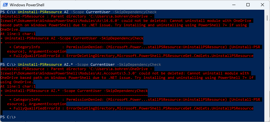 In the last few weeks i’ve noticed that uninstalling some Modules seems to have Problems. Might be it’s related to the CurrentUser Scope that is redirected to OneDrive. Anyone else seeing this?