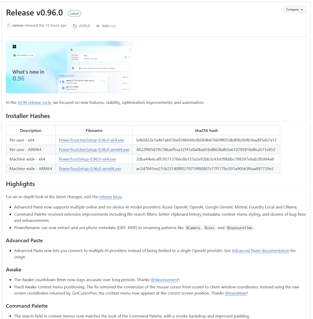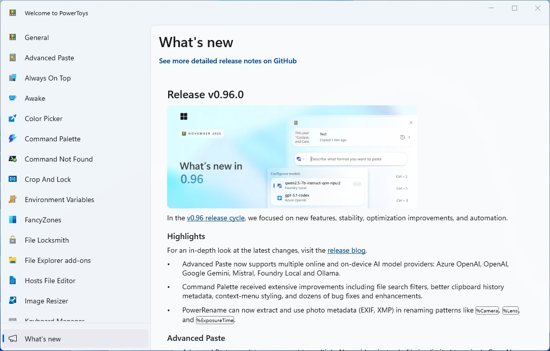 - Advanced Paste now supports multiple online and on-device AI model providers: Azure OpenAI, OpenAI, Google Gemini, Mistral, Foundry Local and Ollama.