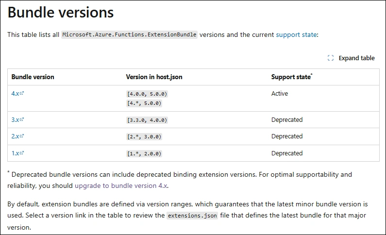 The following Microsoft Learn Website shows the supported Versions of the Extension Bundle
