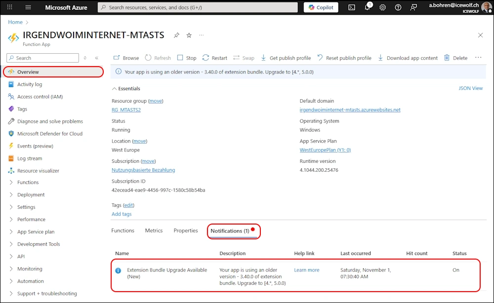 Using the Azure Portal, i can see that there is a Notification on the Azure Function for the Extension Bundle