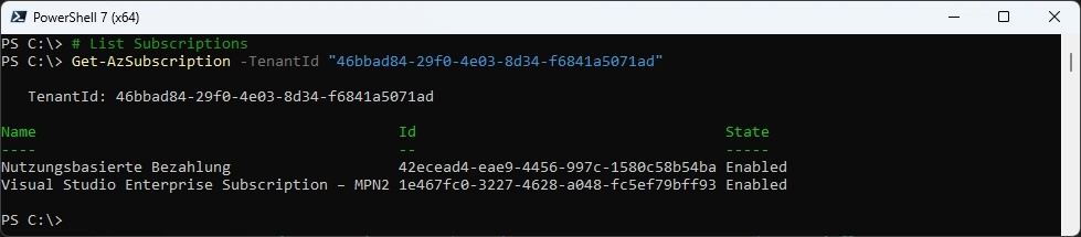Get-AzSubscription -TenantId "46bbad84-29f0-4e03-8d34-f6841a5071ad"