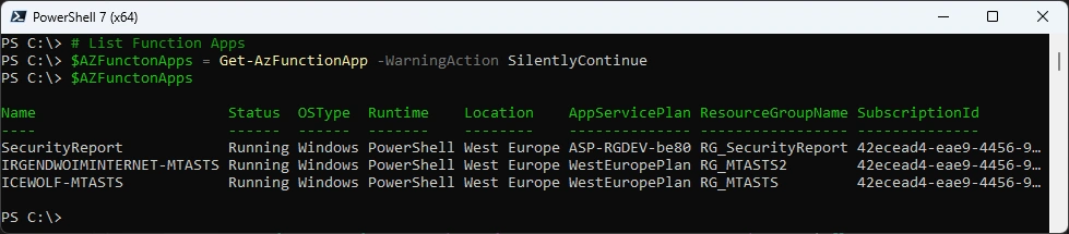 $AZFunctonApps = Get-AzFunctionApp -WarningAction SilentlyContinue