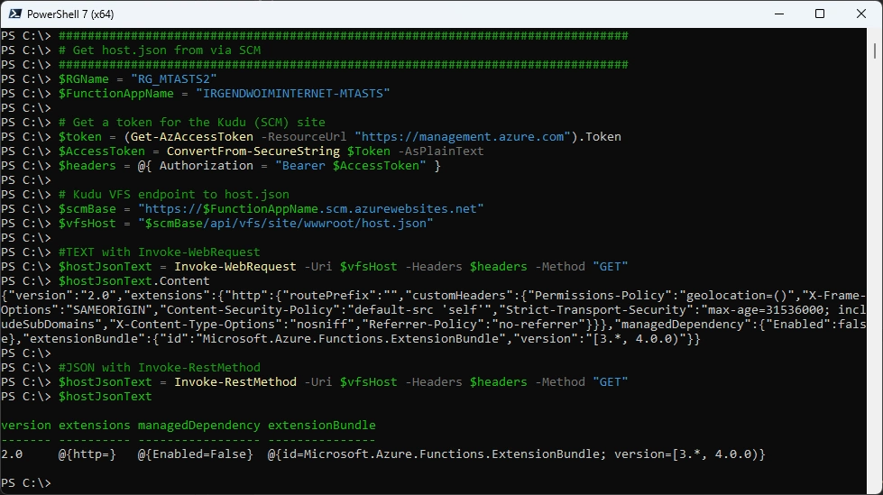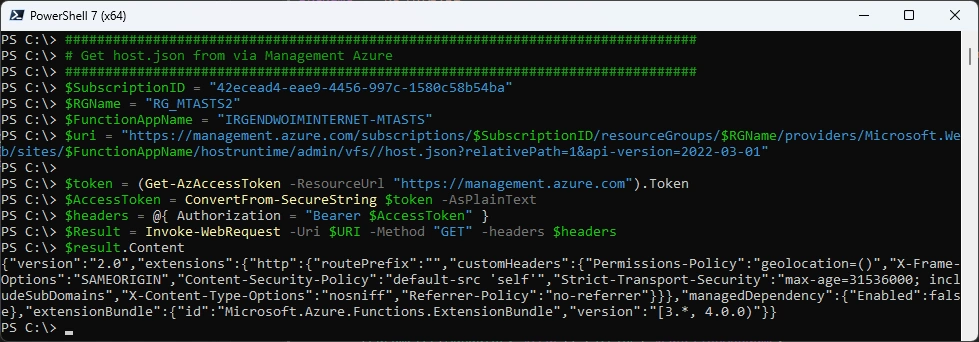 $uri = "https://management.azure.com/subscriptions/$SubscriptionID/resourceGroups/$RGName/providers/Microsoft.Web/sites/$FunctionAppName/hostruntime/admin/vfs//host.json?relativePath=1&api-version=2022-03-01"
