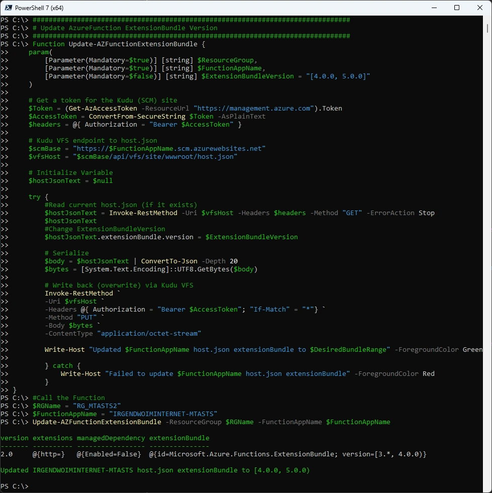 Write-Host "Updated $FunctionAppName host.json extensionBundle to $DesiredBundleRange" -ForegroundColor Green