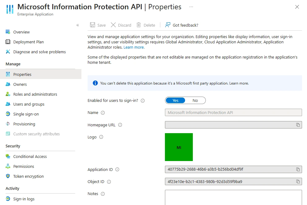 There can be found several Articles like the one below, that suggest to check the Entra Enterprise Application “Microsoft Information Protection API” and set “Enabled for users to sign-in” to “Yes”