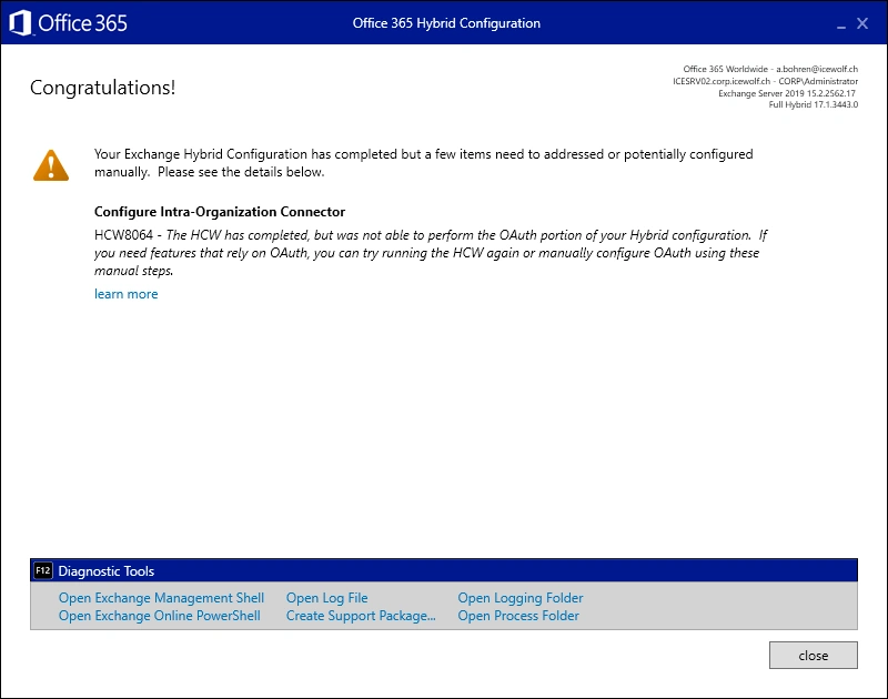 Now i did run the Exchange Hybrid Wizard - it finished with an OAuth Warning