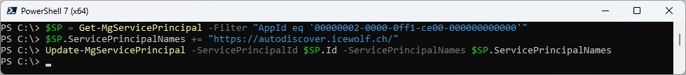 $SP.ServicePrincipalNames += "https://autodiscover.icewolf.ch/"