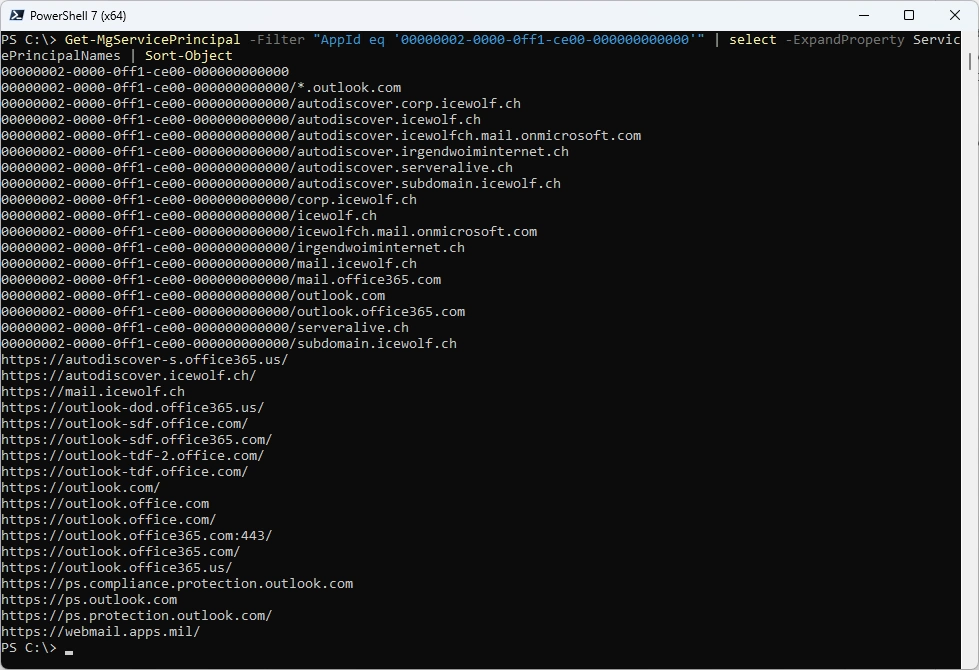 Get-MgServicePrincipal -Filter "AppId eq '00000002-0000-0ff1-ce00-000000000000'" | select -ExpandProperty ServicePrincipalNames