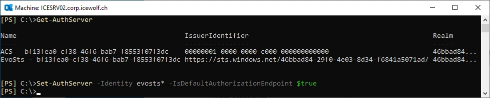 Set-AuthServer -Identity evosts* -IsDefaultAuthorizationEndpoint $true