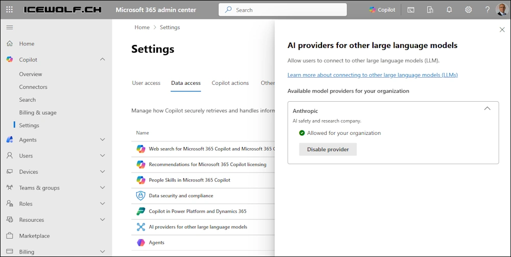 Log in to the Microsoft 365 Admin Center with Global Admin > Copilot > Settings > Data access > AI providers for other large language models