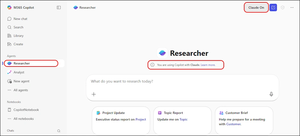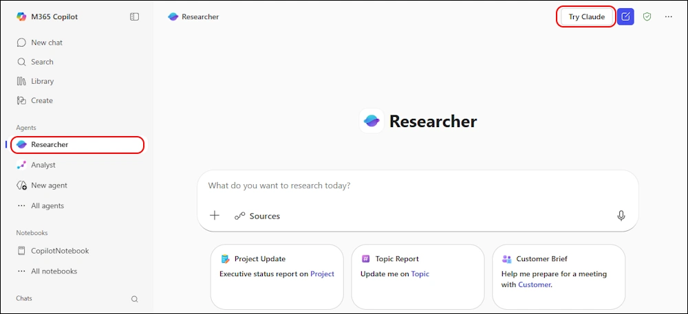 Now in the Copilot Researcher Agent there is the Button “Try Claude”