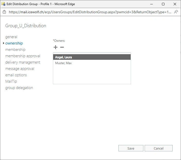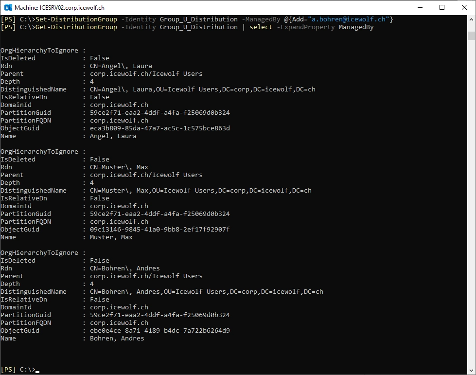 Set-DistributionGroup -Identity Group_U_Distribution -ManagedBy @{Add="l.angel@icewolf.ch"}