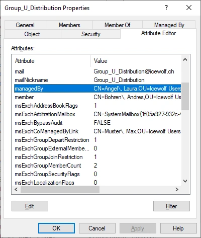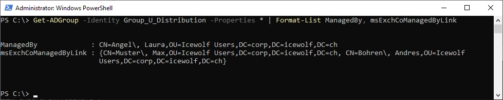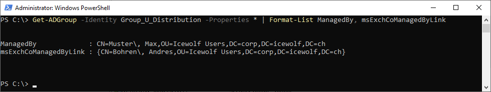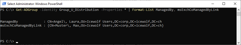 Get-ADGroup -Identity Group_U_Distribution -Properties * | Format-List ManagedBy, msExchCoManagedByLink