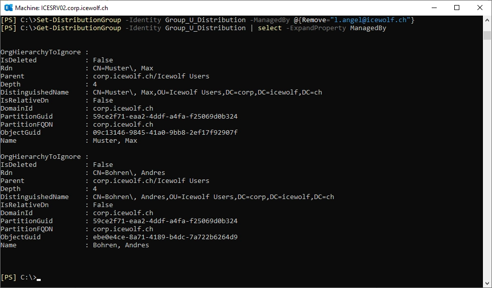 Set-DistributionGroup -Identity Group_U_Distribution -ManagedBy @{Remove="l.angel@icewolf.ch"}