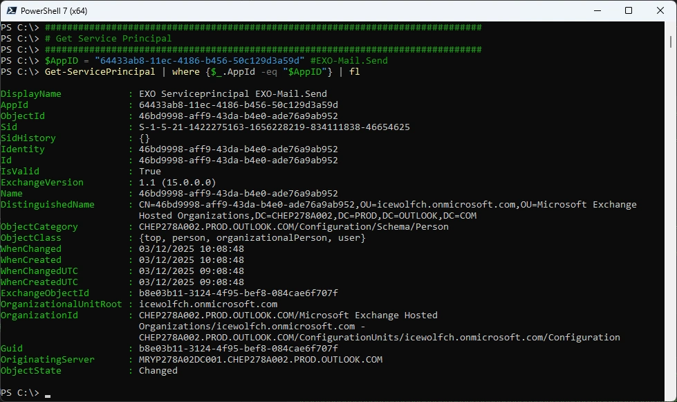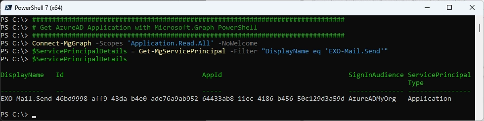 $ServicePrincipalDetails = Get-MgServicePrincipal -Filter "DisplayName eq 'EXO-Mail.Send'"
