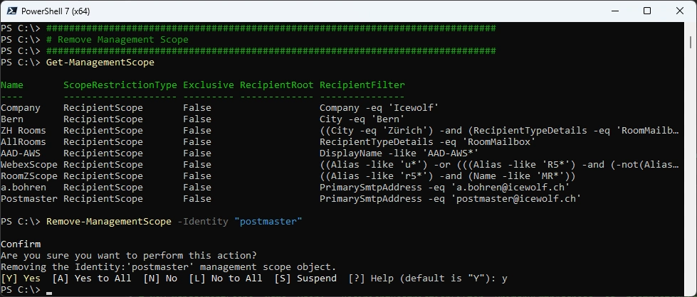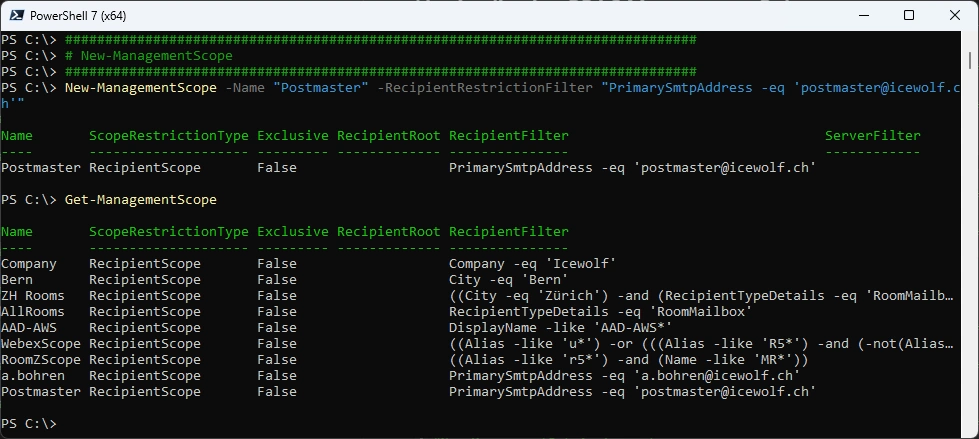 New-ManagementScope -Name "Postmaster" -RecipientRestrictionFilter "PrimarySmtpAddress -eq 'postmaster@icewolf.ch'"