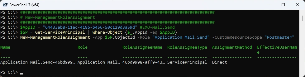New-ManagementRoleAssignment -App $SP.ObjectId -Role "Application Mail.Send" -CustomResourceScope "Postmaster"