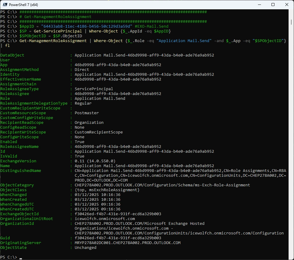 Get-ManagementRoleAssignment | Where-Object {$_.Role -eq "Application Mail.Send" -and $_.App -eq "$SPObjectID"} | fl