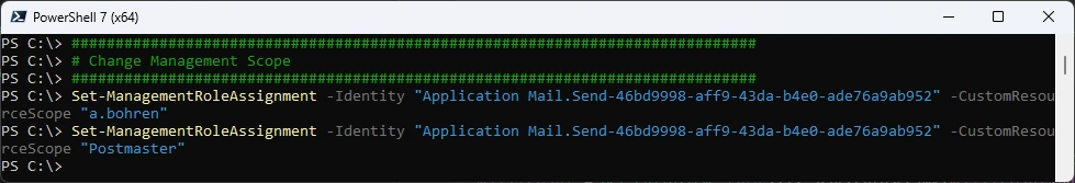 Set-ManagementRoleAssignment -Identity "Application Mail.Send-46bd9998-aff9-43da-b4e0-ade76a9ab952" -CustomResourceScope "Postmaster"