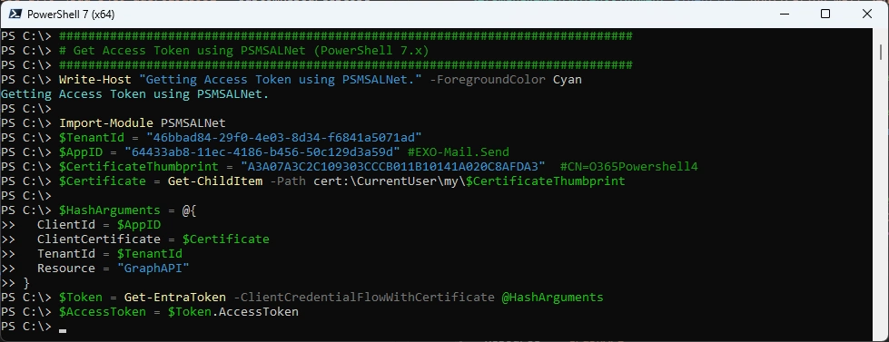 $Token = Get-EntraToken -ClientCredentialFlowWithCertificate @HashArguments