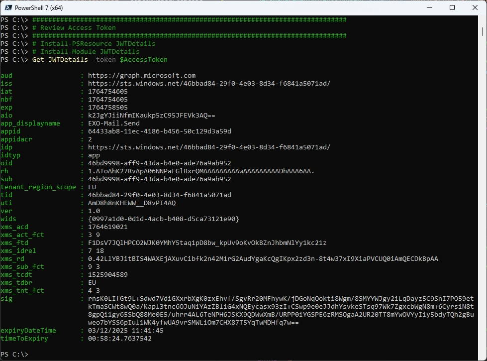 Let’s view the details of the Access Token - there is no Information what permissions where granted from EXO