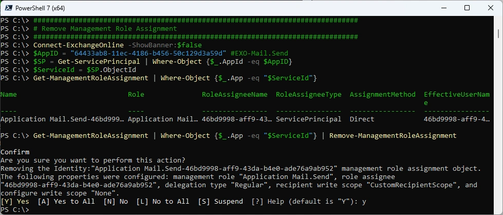 Get-ManagementRoleAssignment | Where-Object {$_.App -eq "$ServiceId"} | Remove-ManagementRoleAssignment