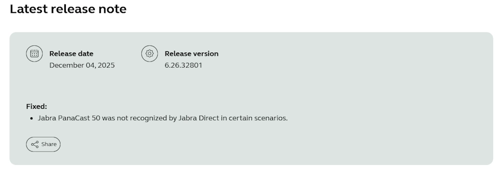 - Jabra PanaCast 50 was not recognized by Jabra Direct in certain scenarios.