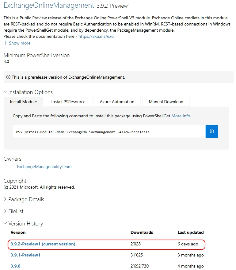 - PowerShell Gallery ExchangeOnlineManagement 3.9.2-Preview1