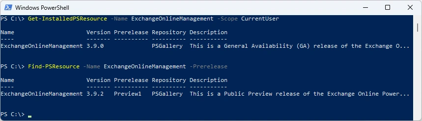 Get-InstalledPSResource ExchangeOnlineManagement -Scope CurrentUser