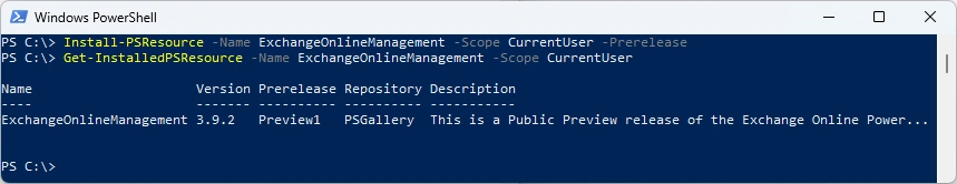 Install-PSResource -Name ExchangeOnlineManagement -Scope CurrentUser