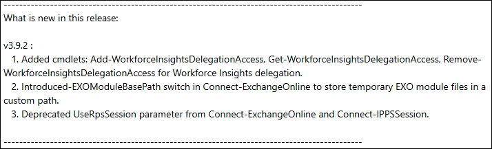 - Deprecated UseRpsSession parameter from Connect-ExchangeOnline and Connect-IPPSSession.