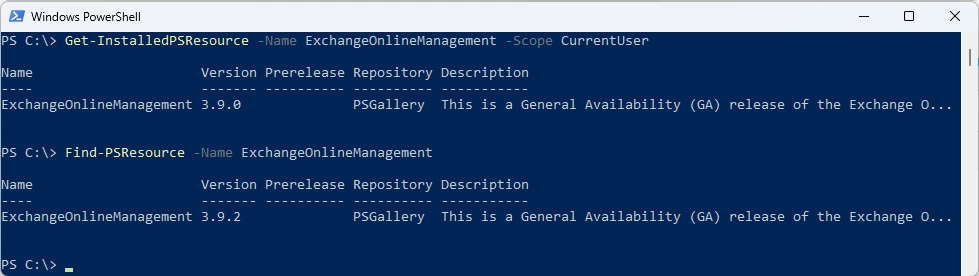 Get-InstalledPSResource -Name ExchangeOnlineManagement -Scope CurrentUser