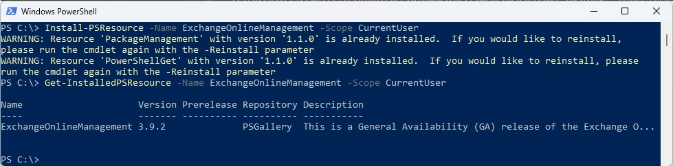 Install-PSResource -Name ExchangeOnlineManagement -Scope CurrentUser